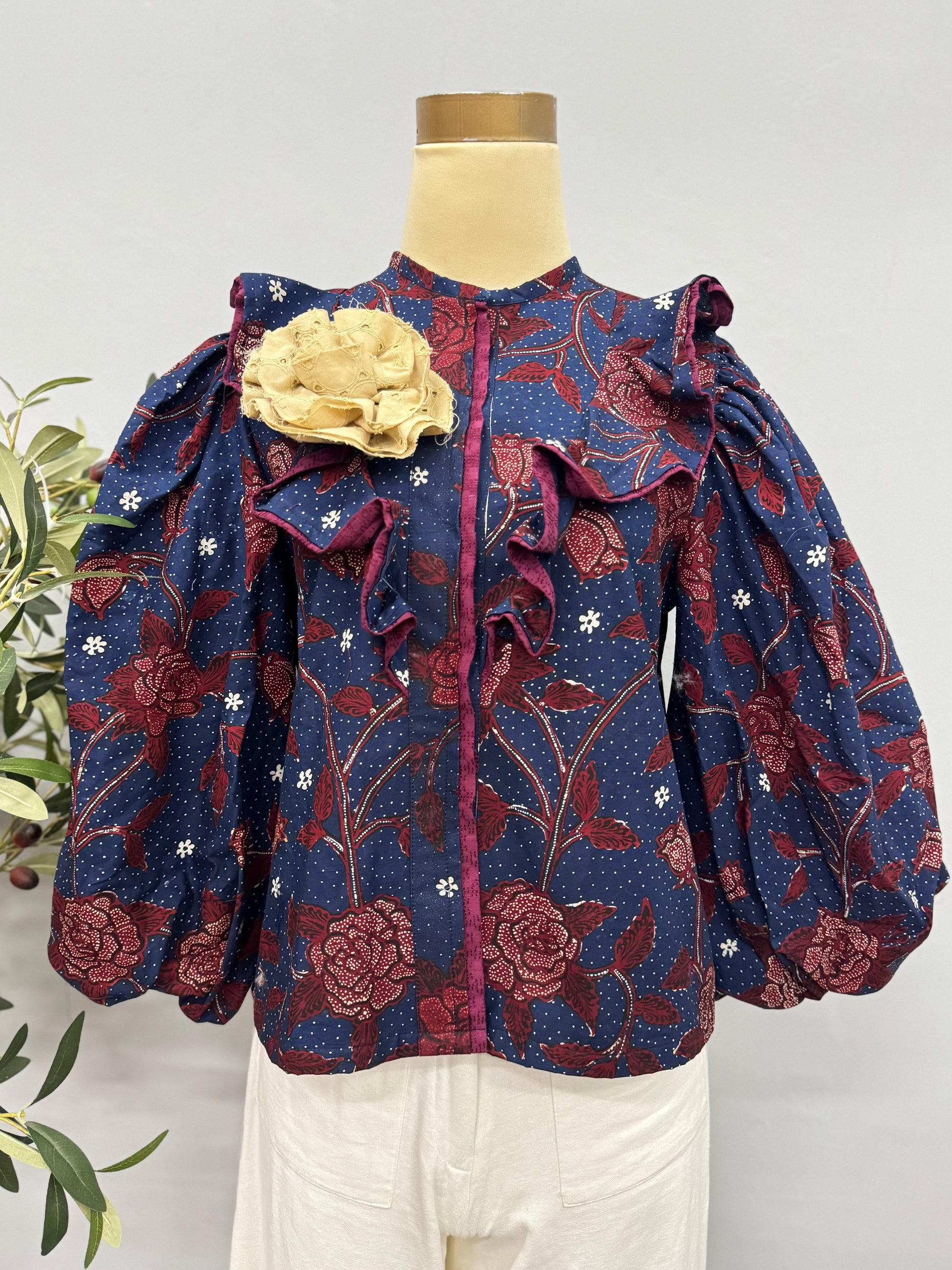 The Andari Blouse features a sophisticated design with voluminous sleeves, a high neckline, and intricate patterns. A statement piece that adds elegance to any outfit