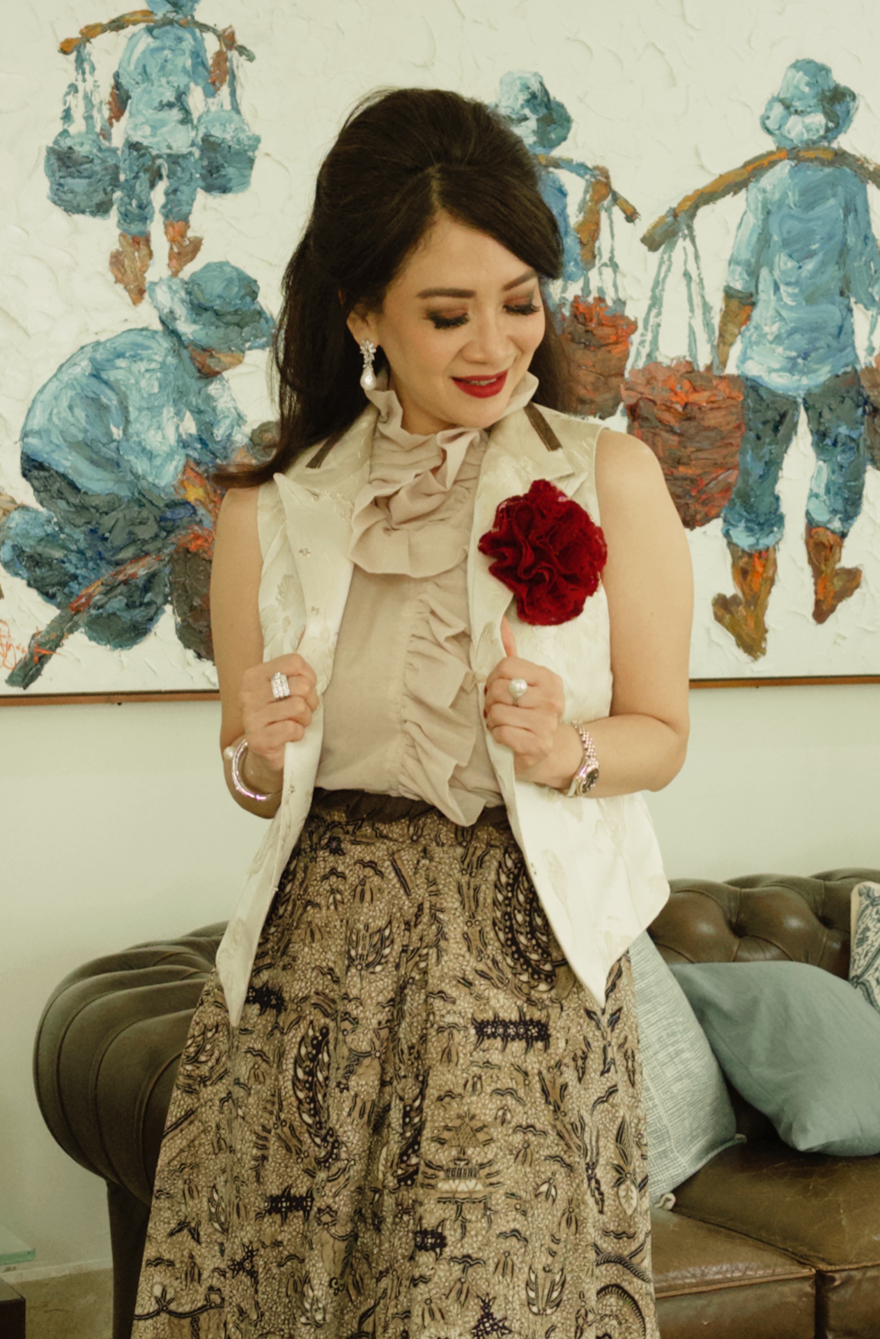 M / Grey flowers motive with brown classic batik accent ASTS51M